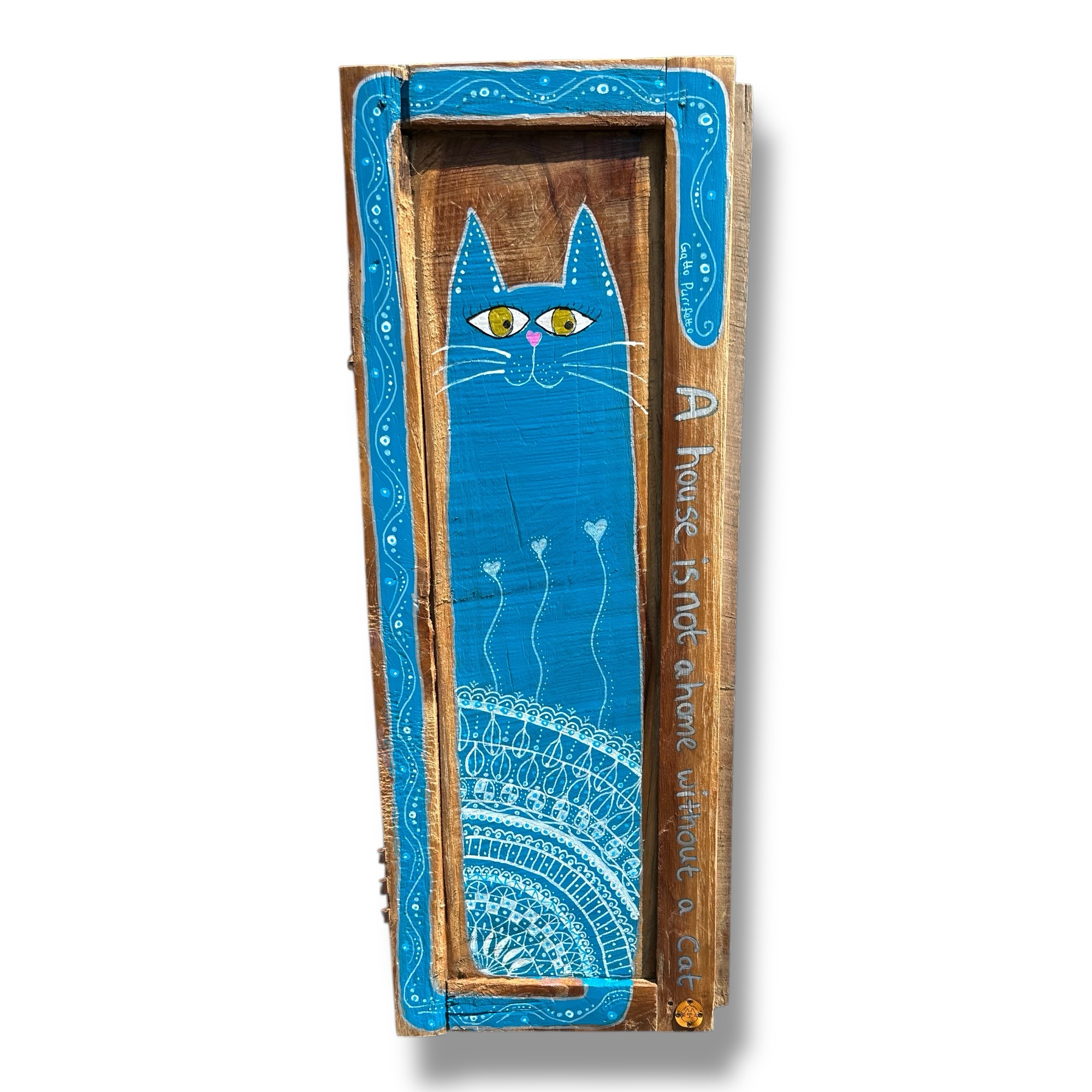 Een huis wordt pas een thuis met een kat – en deze stijlvolle blauwe kat laat dat met flair zien. Met haar sierlijke mandala-pootjes, hartvormige tenen en hypnotiserende blik brengt ze kleur en karakter in elk interieur. Het geheel is geschilderd op een oud houten luik, waardoor het werk extra warmte en diepte krijgt.