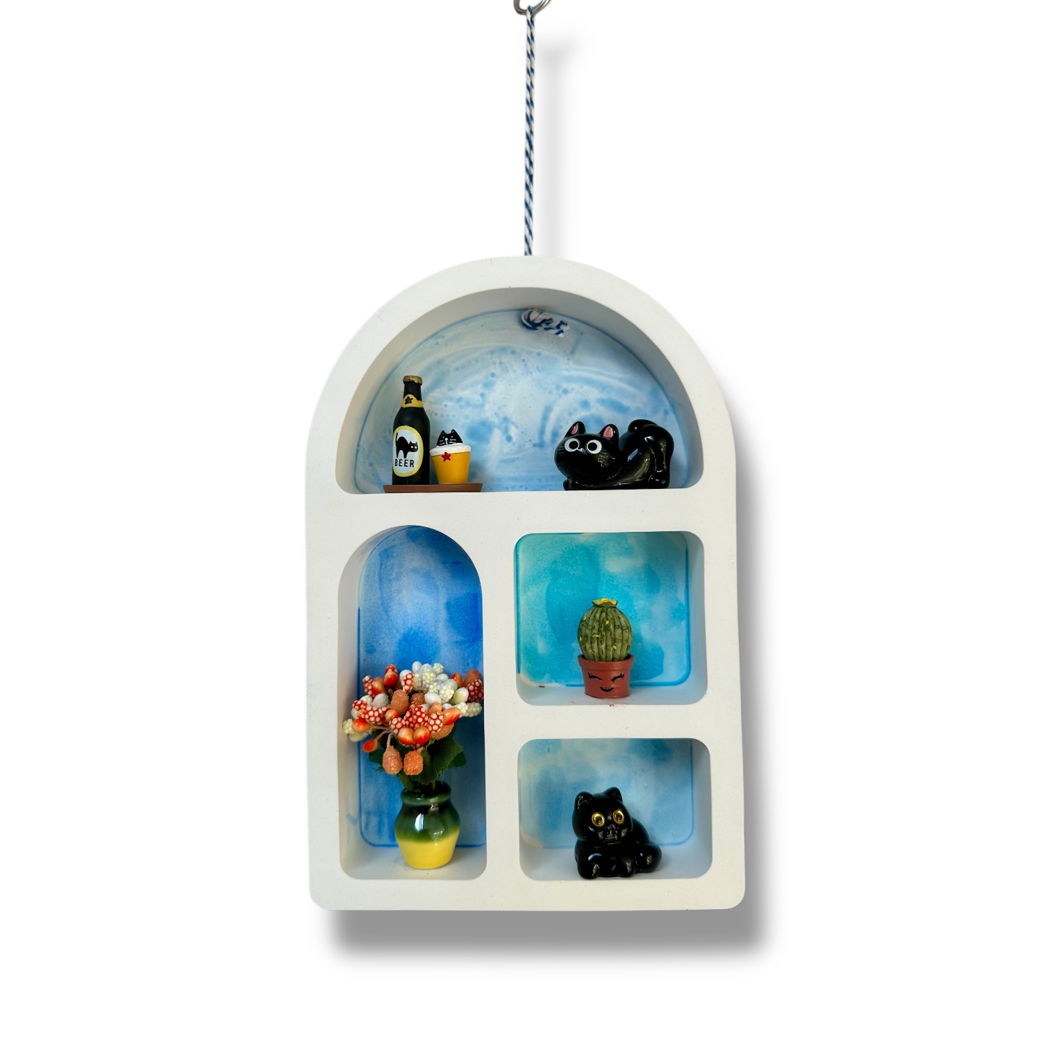 Het nisje is opgebouwd uit meerdere compartimenten met kleine scĆØnes. Bovenin ligt een ontspannen zwart katje naast een mini bierflesje en glas. In de andere vakken vind je een bloemstukje in vaas, een vrolijke cactus in pot en een zittend zwart katje dat je nieuwsgierig aankijkt. Elk vakje vertelt zijn eigen kleine verhaal, samen vormen ze een luchtig en humoristisch geheel.