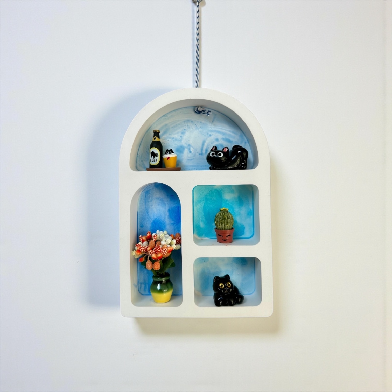Dit decoratieve katten nisje is een speels en sfeervol kunstwerk voor aan de muur. Het nisje is gegoten van pourcelain, een minerale gietstof met een stevige, keramiekachtige uitstraling die mooi mat opdroogt en prettig zwaar aanvoelt. De witte omlijsting vormt een rustig contrast met de blauw geschilderde achtergronden in de verschillende vakken.