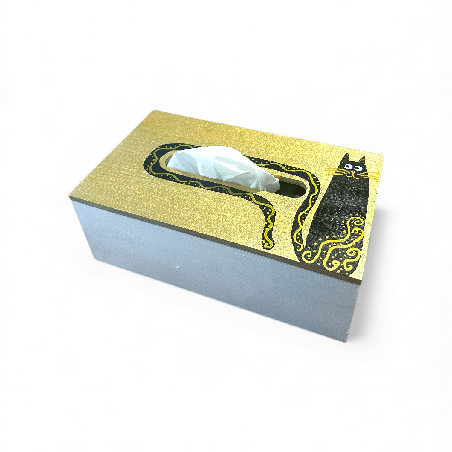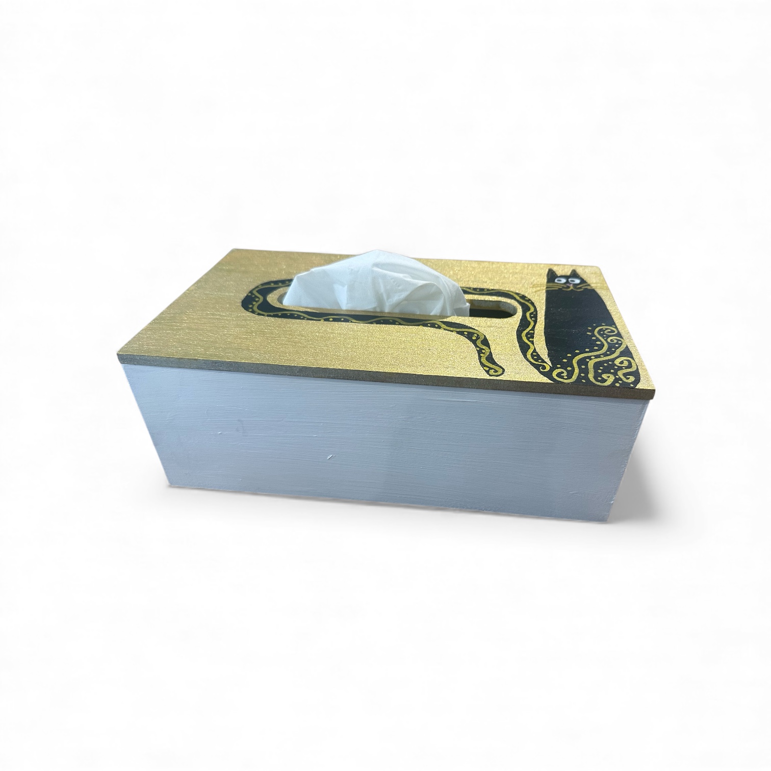 Deze gouden tissuebox is met de hand beschilderd en afgewerkt met een warme glans. Het ontwerp toont een zwarte kat met sierlijke lijnen en speelse accenten, waardoor de box direct opvalt zonder schreeuwerig te zijn.