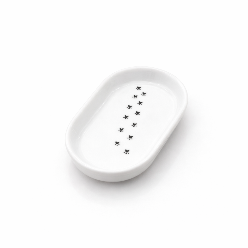 Deze kleine porseleinen serveerschaal van 20 Ć 11 cm is voorzien van een uniek grafisch ontwerp met kattenpootjes. De illustratie is door mijzelf gemaakt met zeefdruk op papier. Het ontwerp is vervolgens via een keramische transfer overgebracht op de schaal en ingebrand op 800 graden, waardoor de decoratie permanent is en onderdeel vormt van het glazuur.