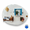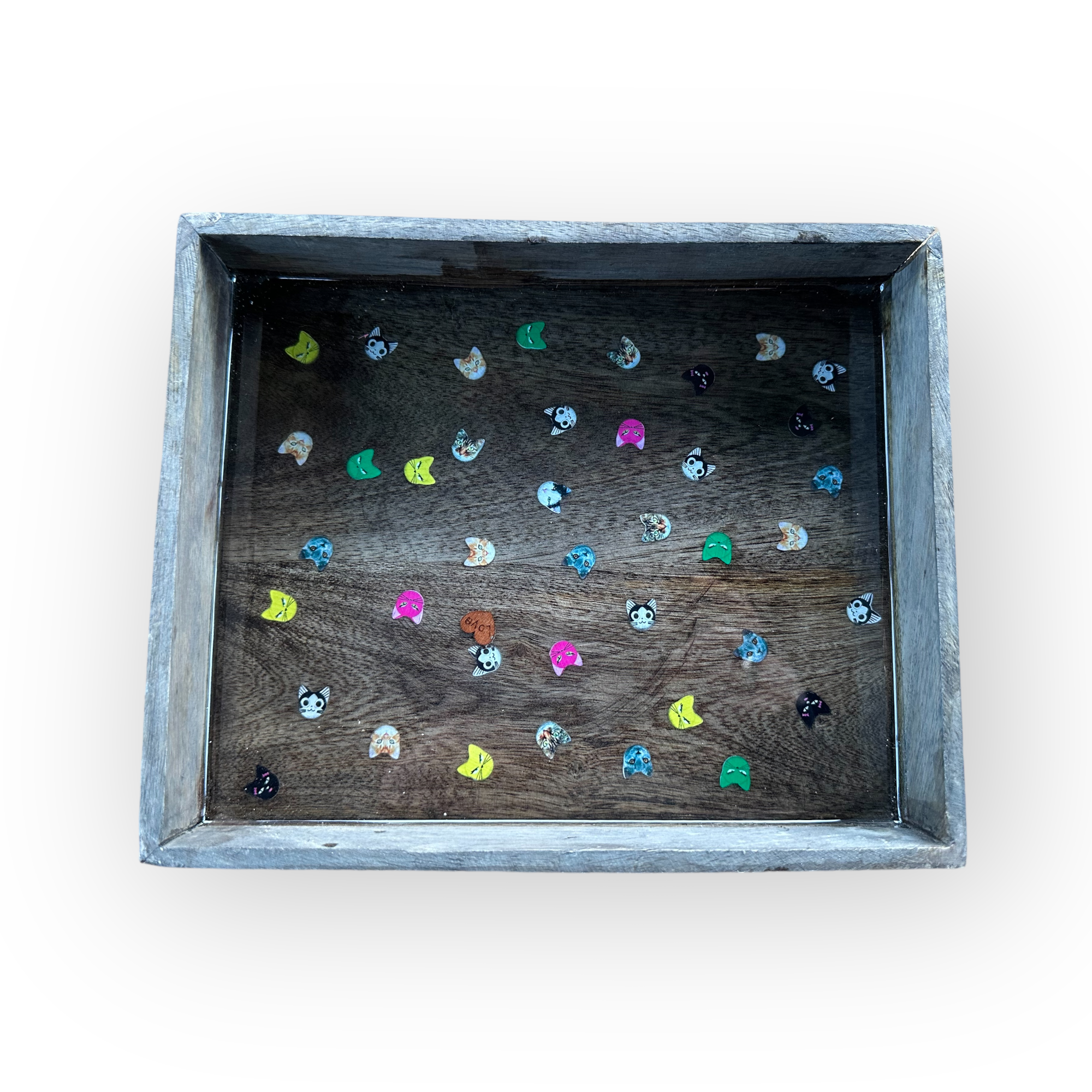 mango wooden tray with miniature cat heads, sealed with a layer of resin.