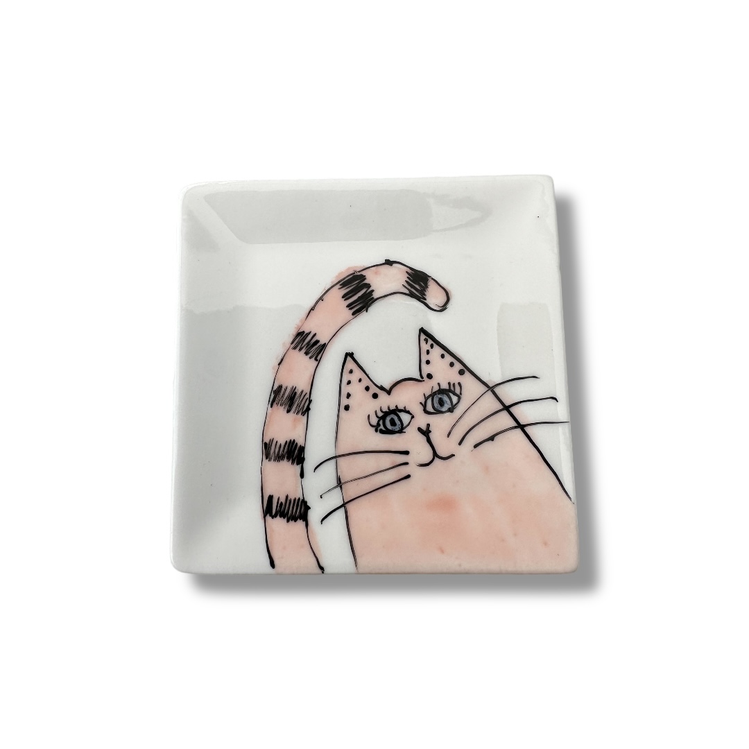 Klein porseleinen bordje van 7 × 7 cm, met de hand beschilderd met een vrolijke kat. Uniek, speels en ideaal als sierbordje of om kleine lekkernijen te serveren.