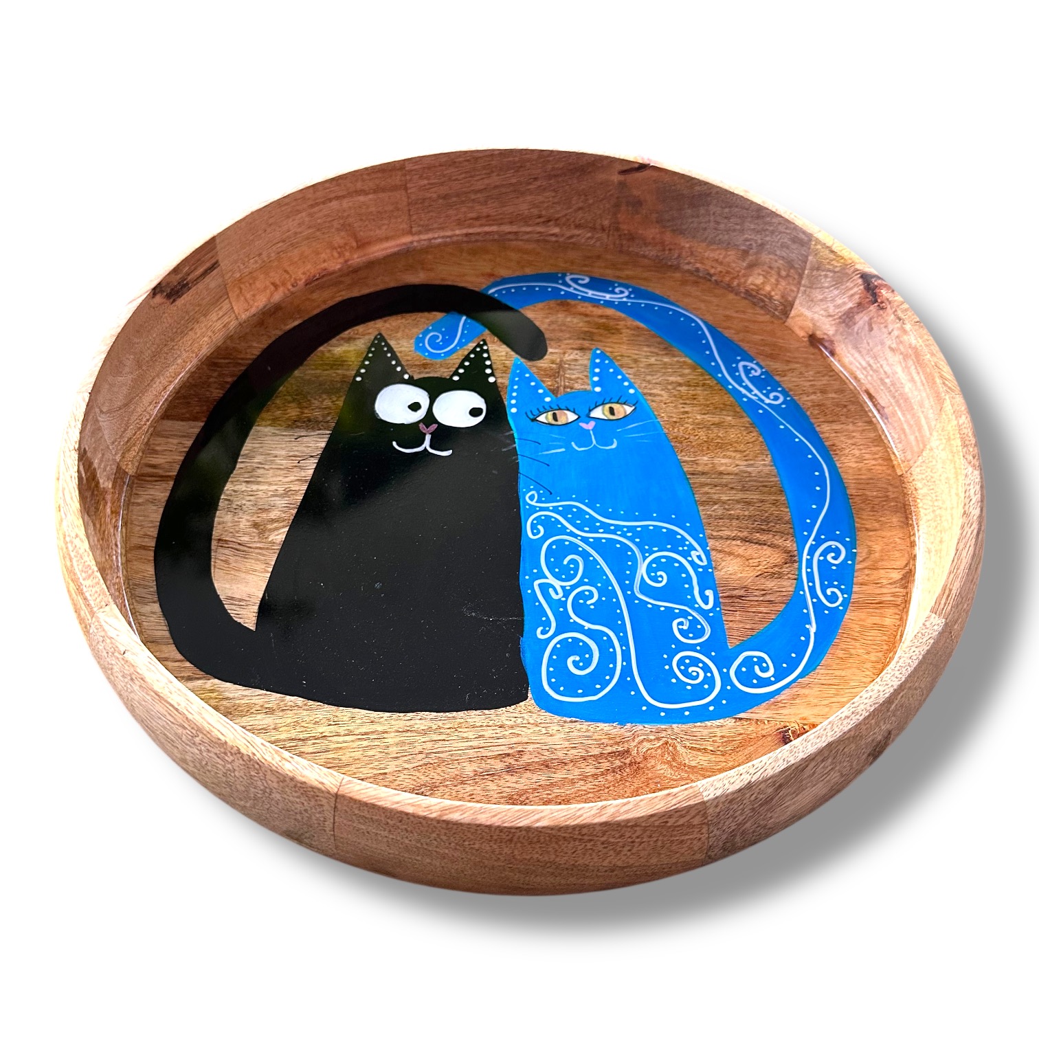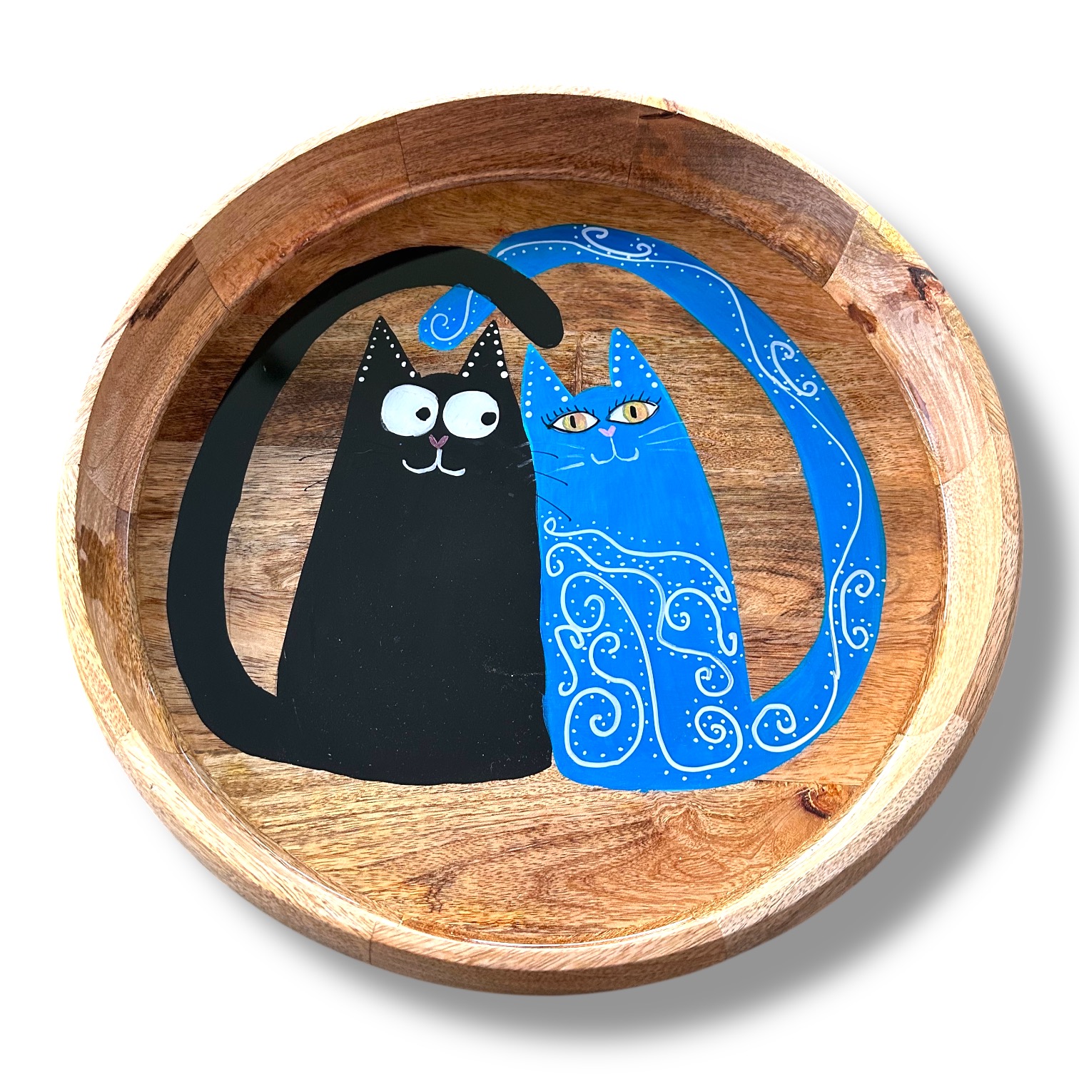 Dit ronde dienblad van mango hout is een echte blikvanger. Met zijn royale formaat van 36.5 cm doorsnee en 7 cm hoog is het zowel decoratief als praktisch. Het kattenduo is volledig met de hand geschilderd in mijn eigen stijl, waarna het geheel is afgewerkt met een glanzende laag epoxy. Die epoxy laag zorgt voor diepte, bescherming en een luxe uitstraling.